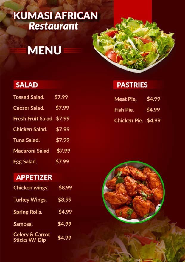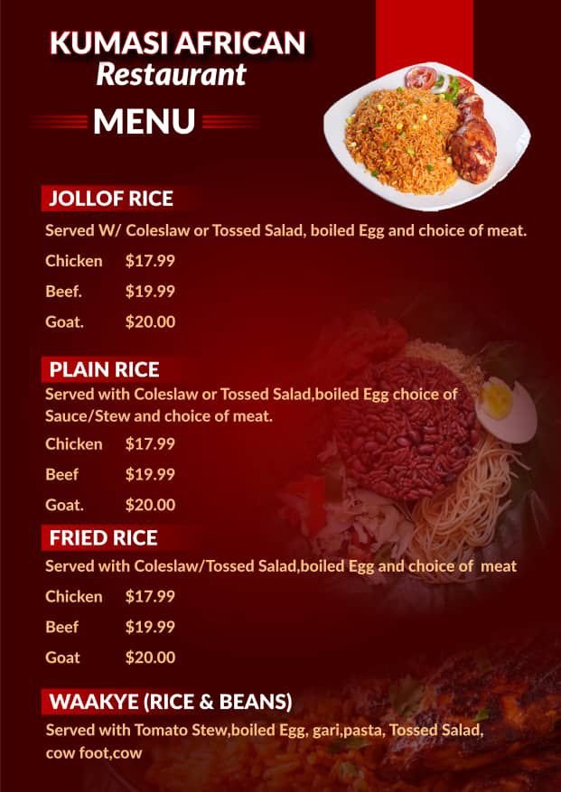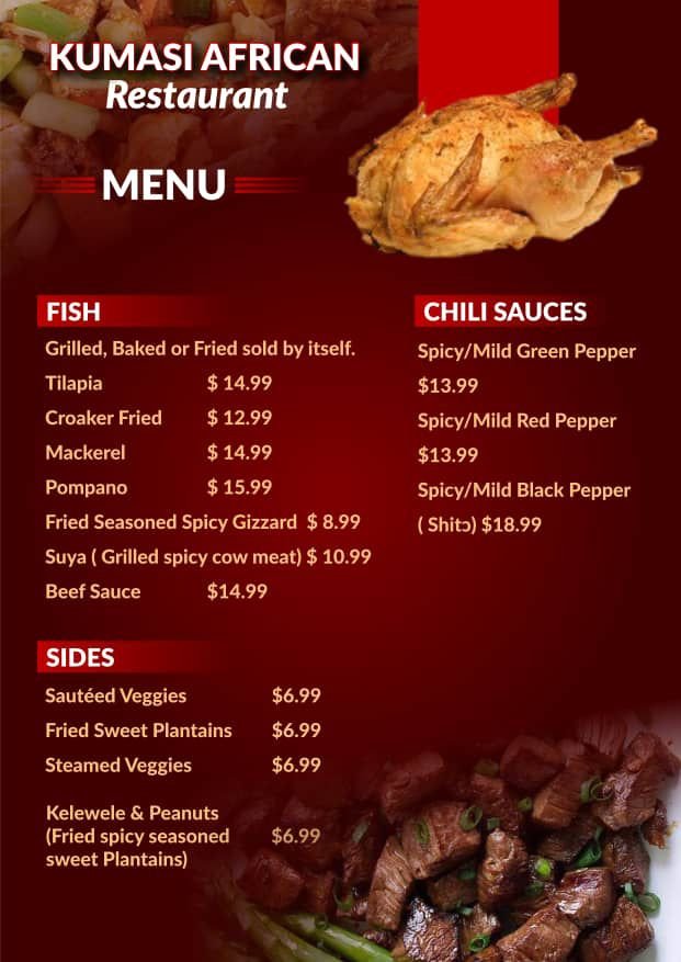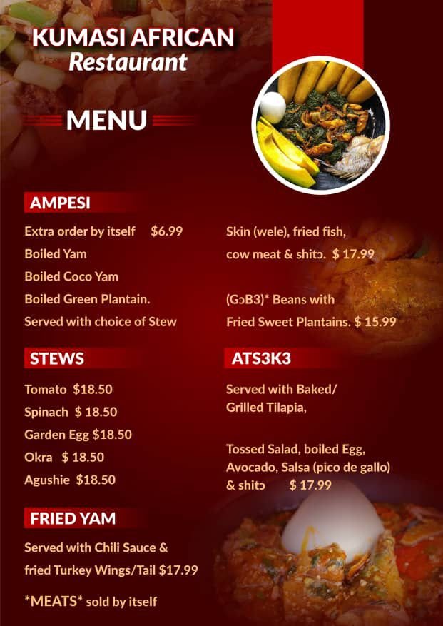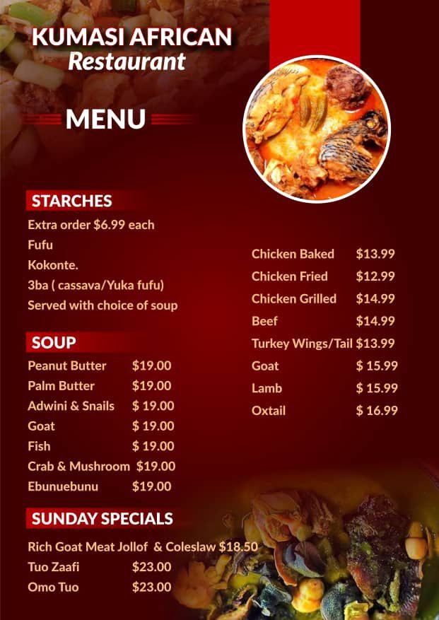 Step into Kumasi African Restaurant, a haven where African American heritage finds its flavorful expression. Our dishes are a heartfelt homage to generations past, embodying the essence of tradition and the warmth of home-cooked meals.